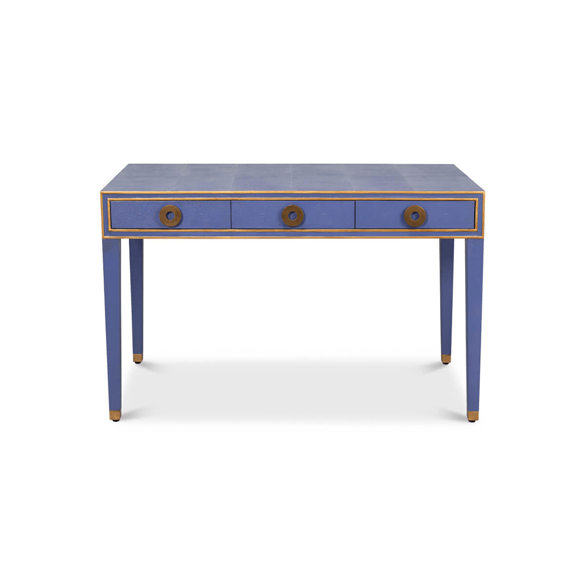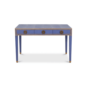 Art Deco Leather Desk In Marlin Blue, a French Art Deco style shagreen embossed leather desk in a rich cobalt marlin blue. With gilded highlight trim, three frieze drawers with modern round pulls, and raised on square tapered legs.