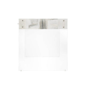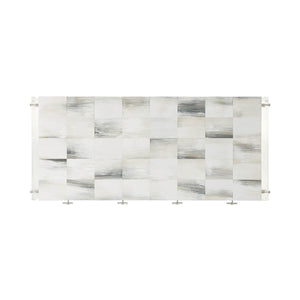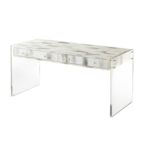 Floating Modern Desk, with a hand-painted faux horn tiled top with two frieze drawers. Acrylic baton pulls with stainless steel collars accent the acrylic end supports with stainless steel accents.