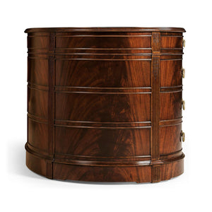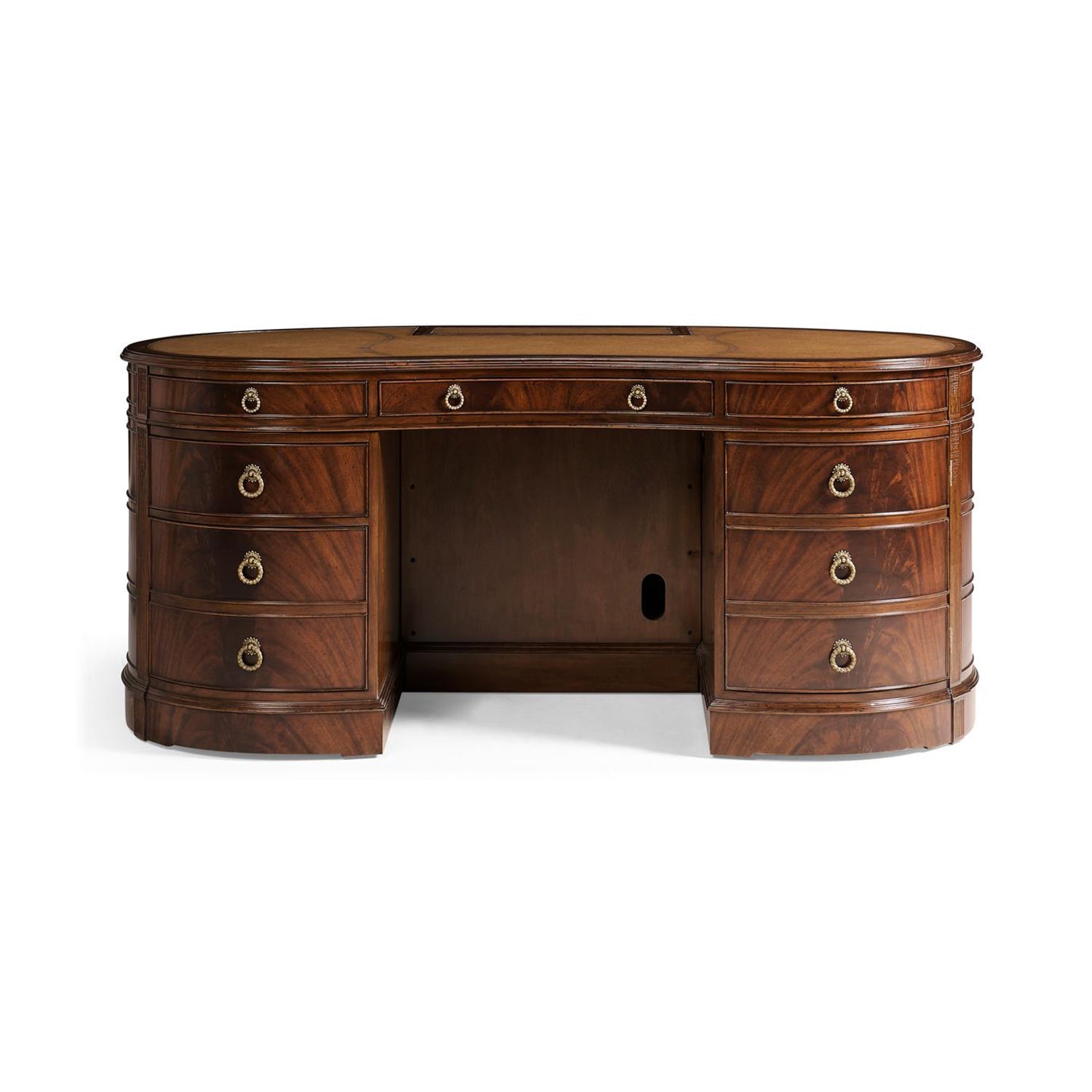 Georgian Kidney-Shaped Executive Desk presents a refined interpretation of late 18th-century English design, defined by its elegant serpentine silhouette and balanced pedestal construction. Crafted in richly figured wood with beautifully executed veneer work, the curved front and softened corners create a graceful, ceremonial presence. An inset leather writing surface crowns the desk, offering both visual contrast and a tactile workspace suited to formal studies and executive offices.