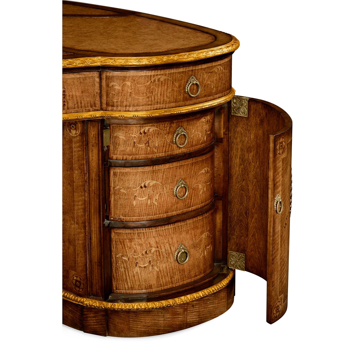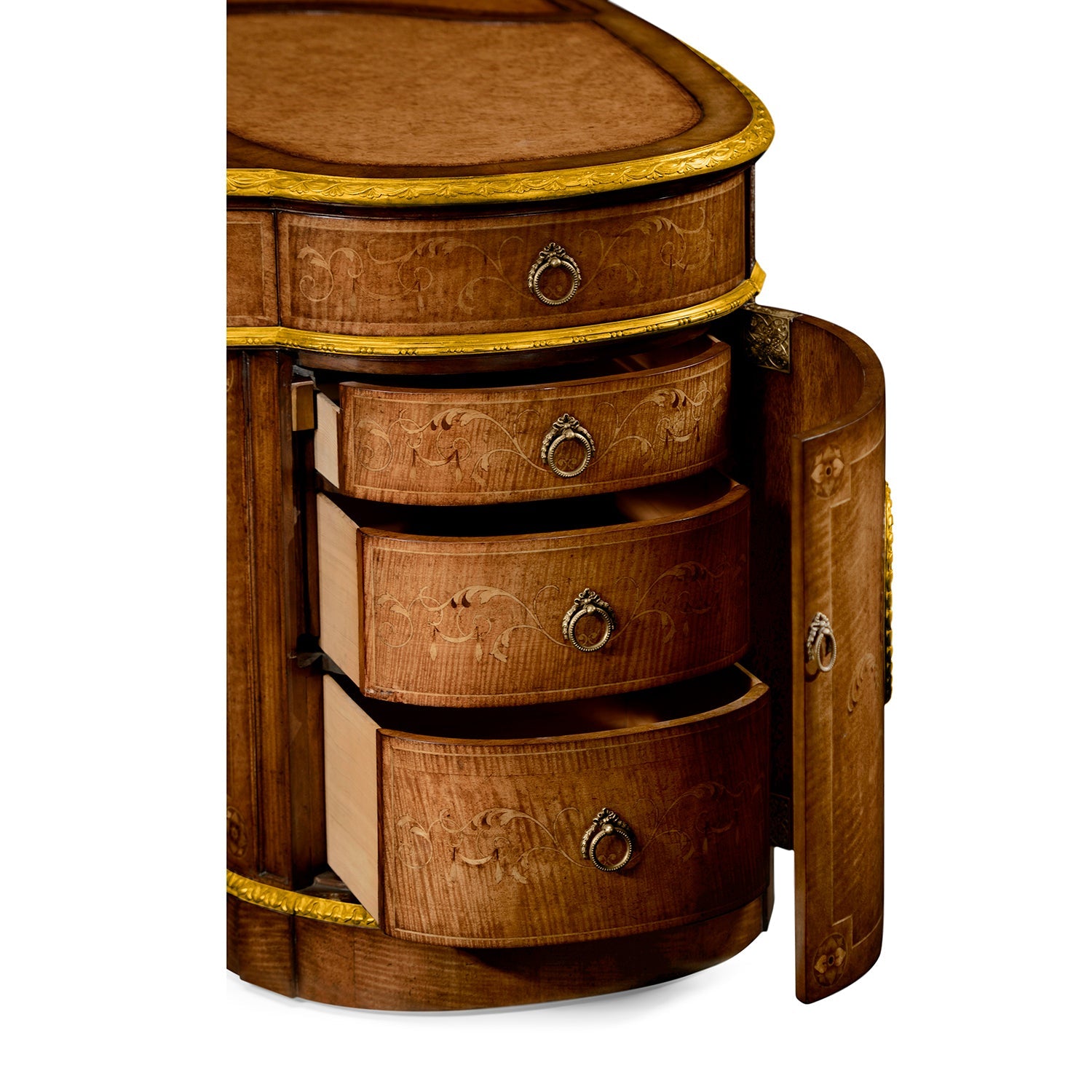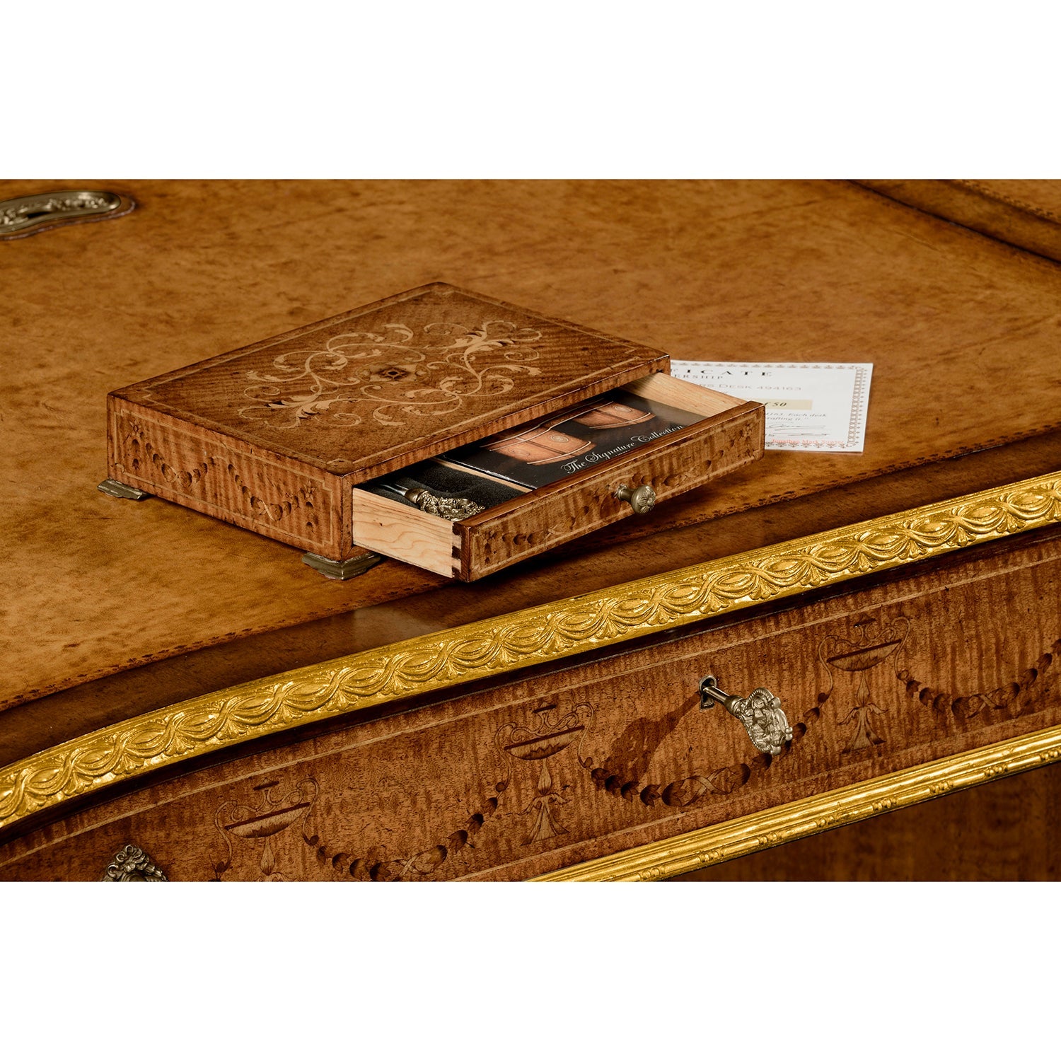 The desk features detailed neoclassical decorations, with careful inlay work, classic banding, and gold highlights that bring out its shape without being too much. The drawers are lined with cedarwood for both function and quality, and two mechanical drawers can sit on the tabletop for added flexibility and style. This desk stands out as a refined centerpiece for any traditional or classically inspired room.