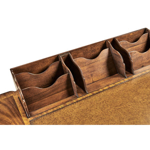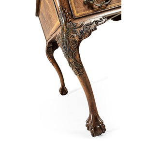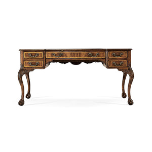 The Georgian Style Walnut Leather Top Desk brings mid-18th-century English design to life, showing off the careful craftsmanship and sculpted details of the Chippendale tradition. Made from walnut, it stands out with its elegant cabriole legs, finely carved shoulders, and classic ball and claw feet that give it a sense of movement and presence. The tan leather writing surface adds warmth and practicality, while subtle molding frames the desk and keeps its proportions balanced.