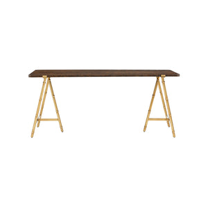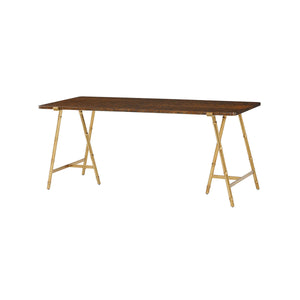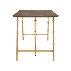 Mid Century Burl Top Writing Table, slender lines form a light and airy design in this modern table. A graceful combination of burl wood in a warm brown polished finish atop an organic faux bois base in a satin bronze finish.