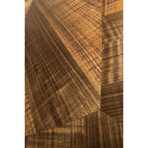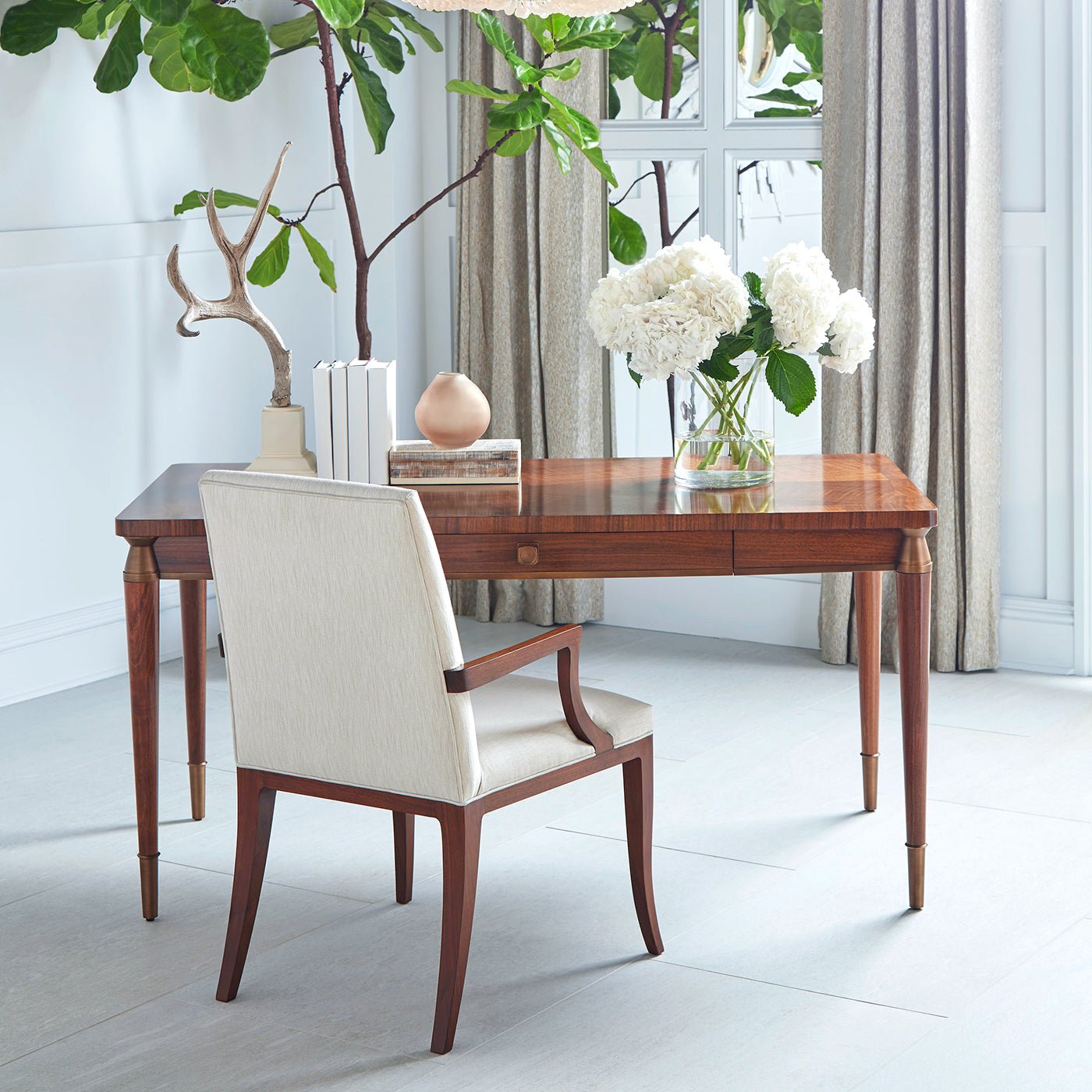 Mid Century modern style walnut desk with a quarter veneered writing surface, a long drawer, brass capital, and raised on turned and tapered legs with brass caps.