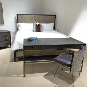Our Midnight Modern Desk stands tall and proud on a bronzed finish metal base, symbolizing its strength and durability. The unique dark cerused greyed finish enhances its visual appeal, adding a touch of sophistication to your workspace.