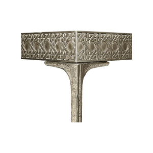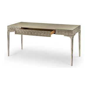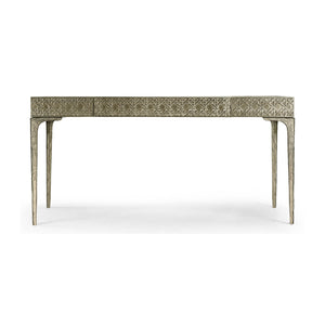 Modern Metal Leather Top Desk, featuring a digitally carved, traditional woven cane design. The carved metal desk boasts mesmerizing textural layers.