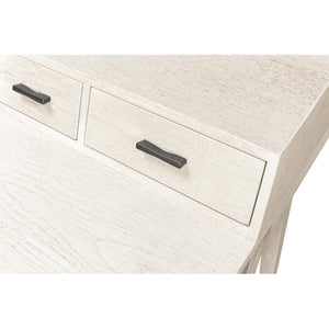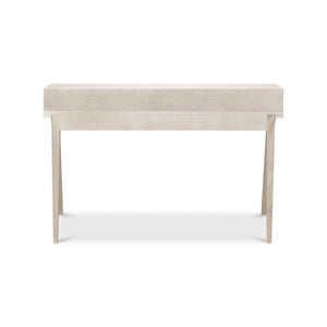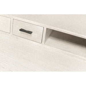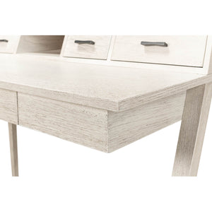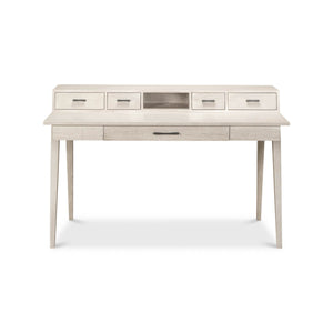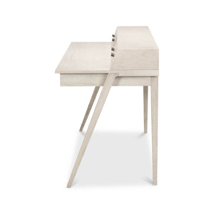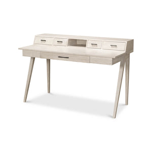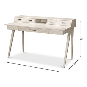 Scandinavian Modern Desk, an ivory finish to this modern writing table that has an angled superstructure with drawers above a rectangular writing surface and with one long frieze drawer and raised on angled square tapered legs.