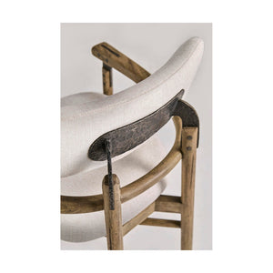 The chair features a contoured upholstered back and a soft, foam-padded seat for comfort. Exposed stainless-steel brackets and joinery add a touch of industrial style. Its armless design makes it easy to place in any dining area, whether formal or casual. Straight tapered legs and sturdy stretchers highlight its solid build. This chair offers both simple elegance and everyday comfort for modern rustic spaces.