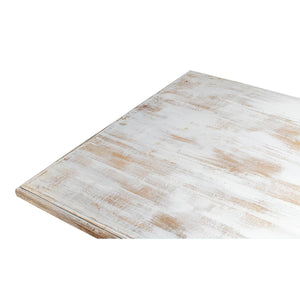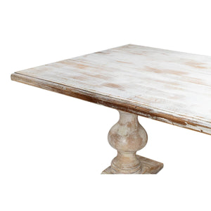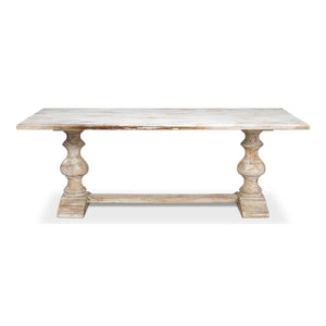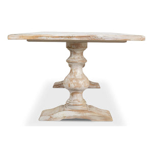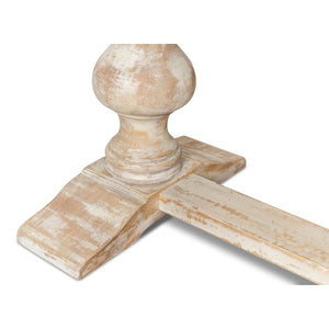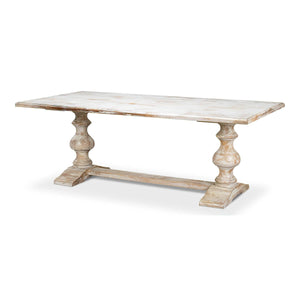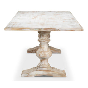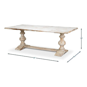 A French Provincial refectory table with a unique distressed white painted finish.  With a molded edge and raised on baluster turned legs in a trestle form with a stretcher.