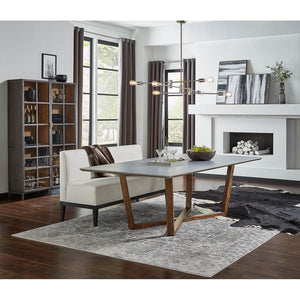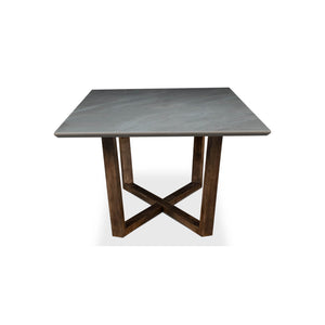 Gray Porcelain Modern Dining Table,the cool gray porcelain tabletop provides a spacious, sophisticated surface for your culinary creations, while the bold, angular beechwood base brings a dynamic contrast with its rich tones and geometric intrigue.