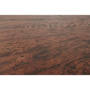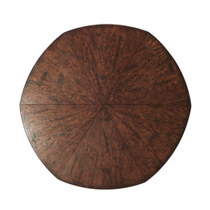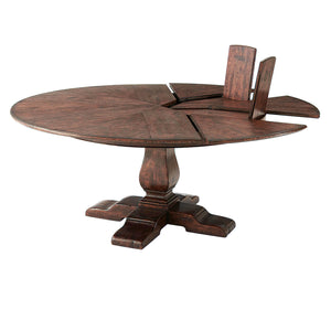 A reclaimed oak and chestnut burl restored circular extending dining table, the segmented top opening to reveal six self-storing fold-out leaves above a plain frieze, on a vase column support and crossover refectory feet.