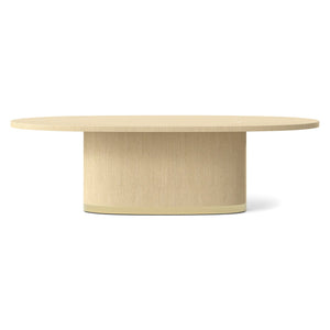 The oval pedestal base is wrapped in matching wood and anchored by a brushed brass trim that gives the entire piece a warm, tailored finish. A perfect fit for elegant entertaining, this table elevates modern dining with dramatic simplicity.