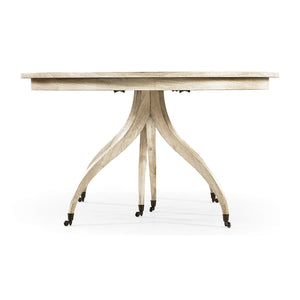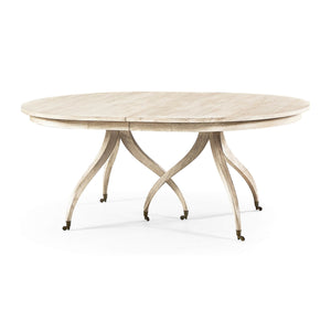 Mid Century Extendable Dining Table. Inspired by an early 19th-century Regency design, this dining table is timeless and features an elegant and functional design. The oval extending table is perched atop sinuous, flowing classic spider legs with brass castors. A stripped finish showcases the unique aging qualities of walnut veneers for a visually inspiring modern aesthetic. Removable leaves give the option to extend up to 112 inches for grand gatherings.