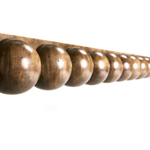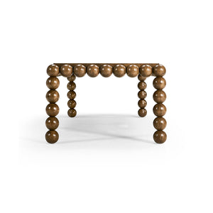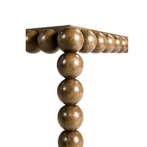 The table's solid wood-stacked orbs form a foundation that fuses art and functionality. These orbs create a unique and eye-catching leg and apron design that adds personality to the piece.