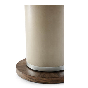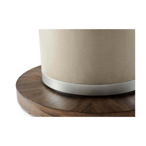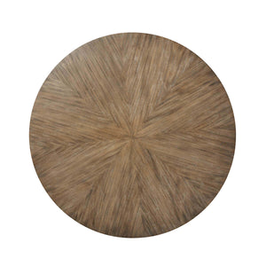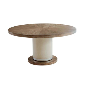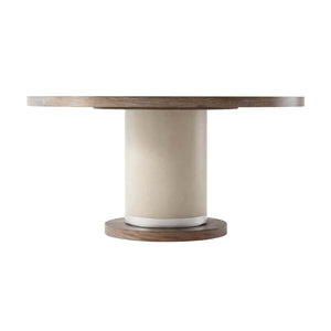 Mid Century Style 60 Round Dining Table with a sunburst inlaid mangrove primavera veneered circular top in raised on a cylindrical column pedestal wrapped in Komodo embossed leather, with brushed nickel accents and a veneered platform base.