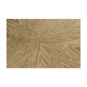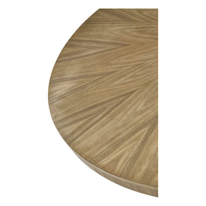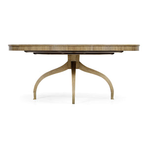 Mid Century Style Round Dining Table - a modern style bleached walnut round dining table with a rayed figured walnut veneer top and apron, above an unusual form sabre leg pedestal base with brass top cap feet.