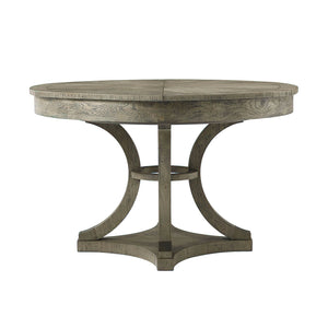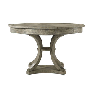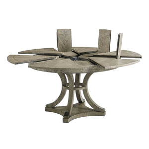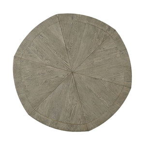 Modern Jupe Extending Greyed Oak Dining Table, a greyed oak parquetry and walnut inlaid top round self-storing extension dining table with six pull-out top sections opening to reveal 6 fold-out leaves, above inswept solid oak legs with a central collar and 'Vintage' metal cast cappings.