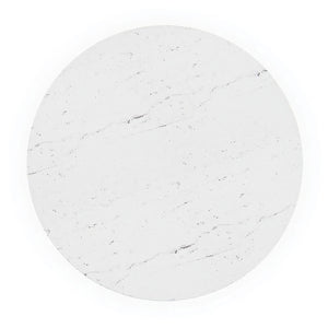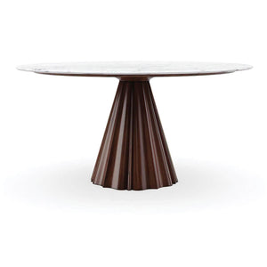 A modern marble top round dining table with a carved walnut base. Designed with a reverse bevel, its veined white marble top creates the illusion of a thin stone resting on its conical base. Intimate and intentional, it elevates entertaining and quiet evenings in. Comfortably seats 4 to 6.