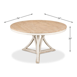 Contrasting the natural pine is an unusual form distressed white base. This distinctive base not only supports the table securely but also adds a unique aesthetic appeal with its distressed finish. The white base offers a modern twist to the rustic top, making the table a versatile piece that fits seamlessly into various interior decors.