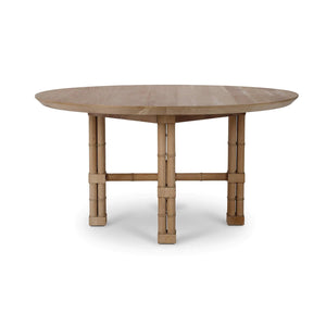 A timeless fusion of British colonial elegance and island-inspired design, the Palm Beach Regency Round Dining Table offers refined craftsmanship with relaxed sophistication. Hand-carved from mahogany in a light fruitwood finish, this statement table features faux bamboo legs in the form of classic English cluster columns, joined by an X-form stretcher that adds both stability and architectural flair.