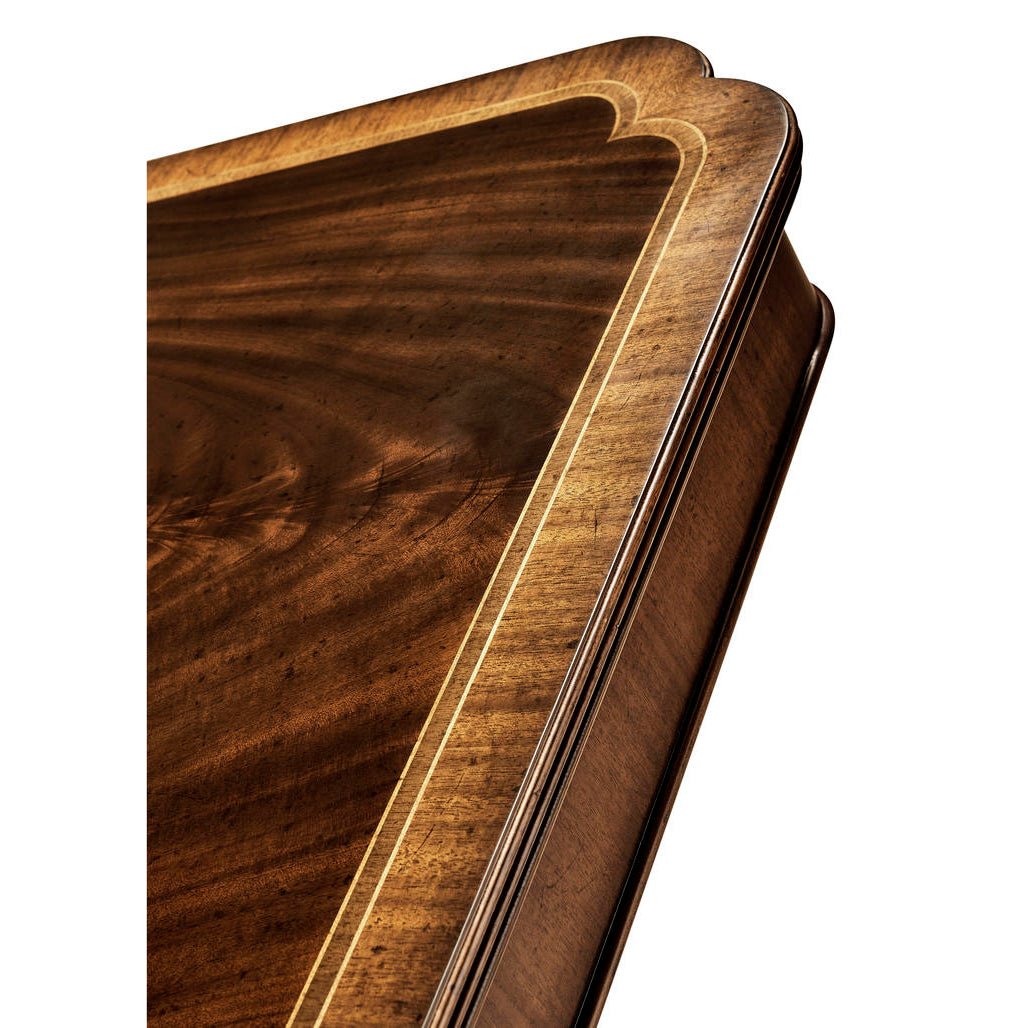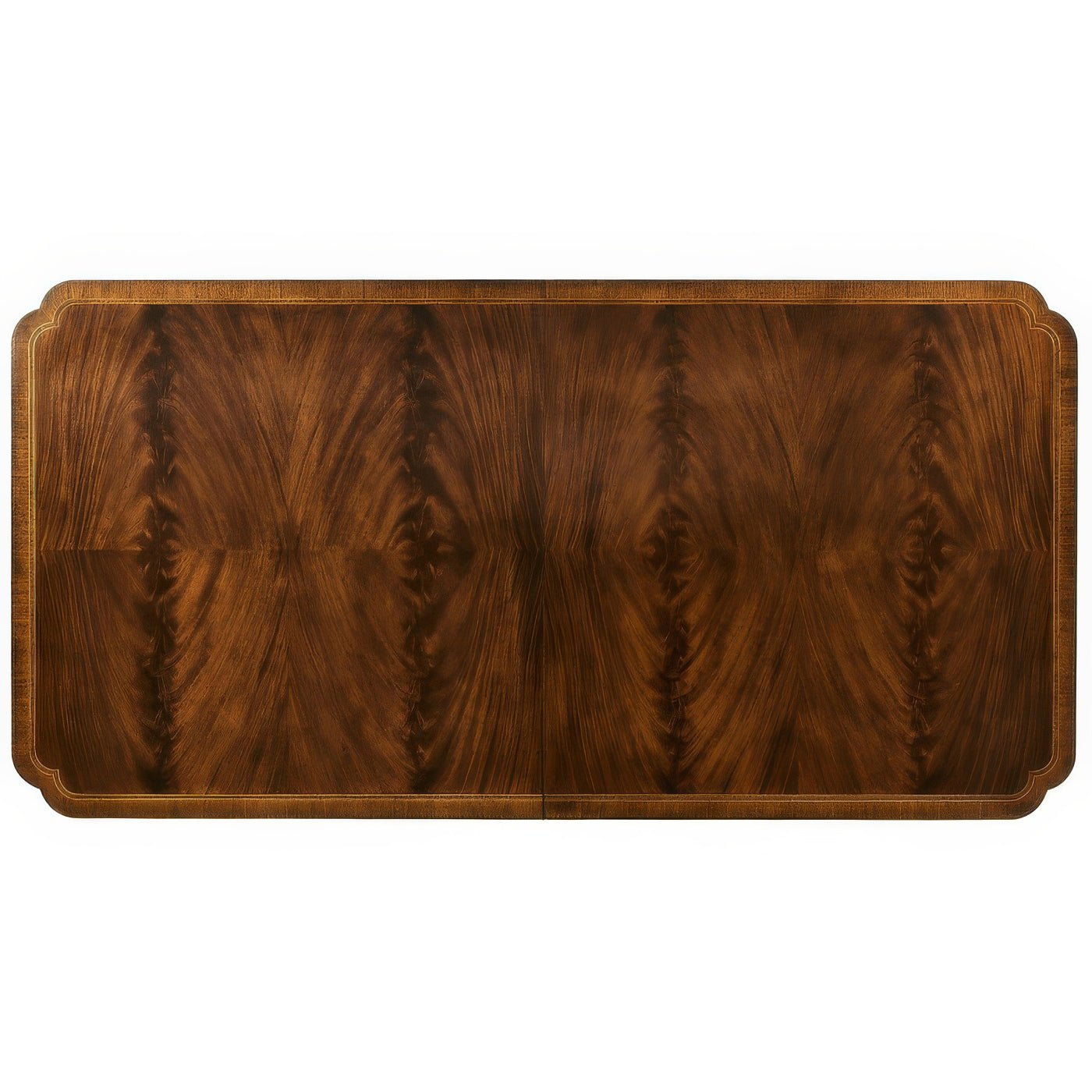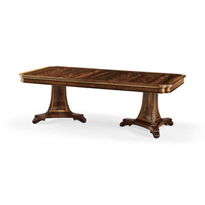 The Regency Mahogany Double Pedestal Extending Dining Table shows the formal elegance and balanced design of early 19th-century dining furniture. Its long rectangular top features richly figured wood veneer, arranged in wide, even panels that bring out the wood’s natural depth and warmth. Rounded corners and simple edge molding add a touch of refinement, giving the table a stately and composed look.