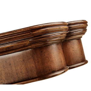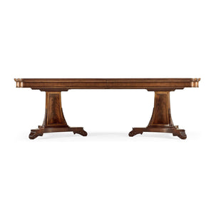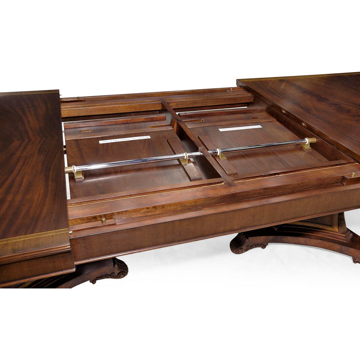 The table stands on two tapered pedestal bases, showing classic Regency style with simple carving, stepped plinths, and scrolled feet. The double-pedestal design offers both balance and plenty of legroom, making it a great fit for formal dining rooms and large spaces. With extension leaves, the table easily adapts from small dinners to big gatherings, always keeping its elegant shape and timeless look.