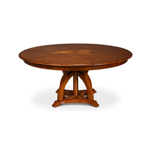 The Round Walnut Jupe Dining Table - 70", brings a timeless 19th-century innovation into the modern age with exceptional craftsmanship and style. Finished in a rich Old World Walnut, the tabletop features a stunning inlaid star pattern that expands seamlessly as you open the leaves. The self-storing Jupe expansion mechanism, crafted from extruded aluminum, ensures smooth operation and simplified assembly.