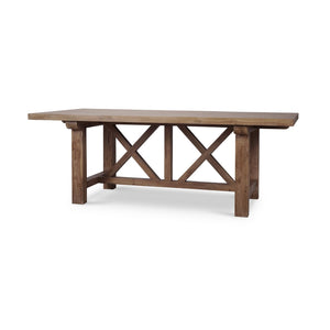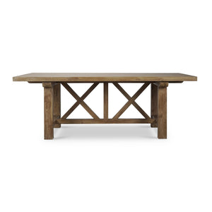 The reclaimed teak solid wood showcases beautiful grain patterns, adding a touch of natural artistry to your dining room. With a bold butcher block form top and a crossbeam trestle base that not only provides stability but also enhances the rustic aesthetic, making this table a standout piece in any setting.