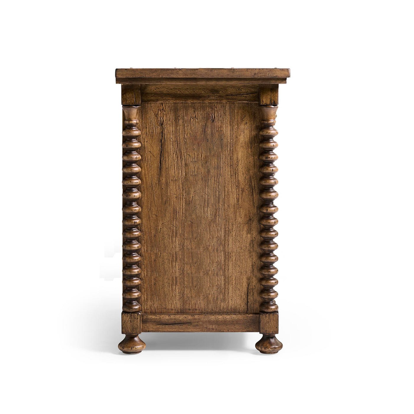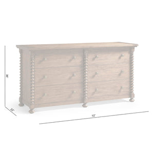 This dresser is designed to be both eye-catching and practical for daily use. The spool-style corner posts and carved ball feet are inspired by Jacobean and William & Mary furniture. Framed drawer fronts add structure, while nine large drawers give you lots of storage for clothes or linens. Antique brass drop pulls stand out against the rustic wood, making this piece a classic and useful addition to any modern home.