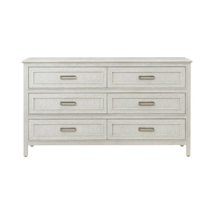 The Six Drawer White Oak Dresser offers a refined take on casual elegance, blending modern lines with classic craftsmanship. Constructed from oak and finished in a soft white dover finish, this piece highlights the natural beauty of the wood grain with subtle chevron parquetry. Six spacious drawers provide ample storage, each adorned with rectangular metal pulls in a brushed finish for a clean, contemporary touch.