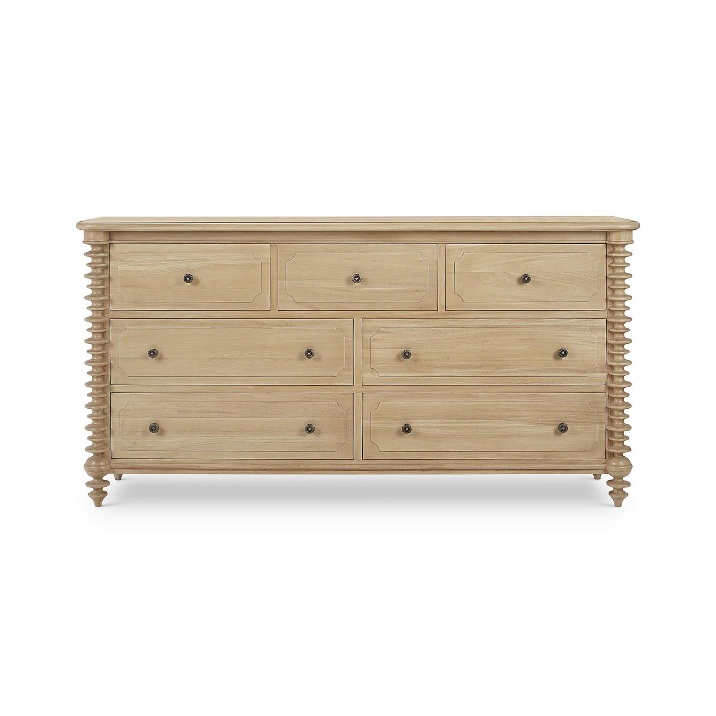 The Spool-Turned Light Wood Dresser, finished in light Fruitwood, combines classic American style craftsmanship with a modern look. Its spool turned details and balanced shape are inspired by 19th-century Colonial Revival design, while the pale wood finish gives it a fresh, contemporary feel.