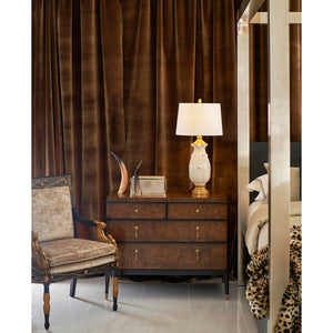 The piano black lacquer accents provide a striking contrast against the dyed brown burl veneer, creating a visual harmony that captivates the eye. This contrast of materials adds depth and drama, making the chest a work of art.