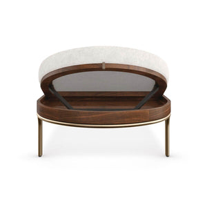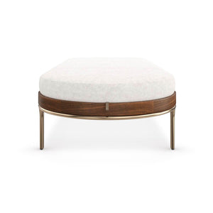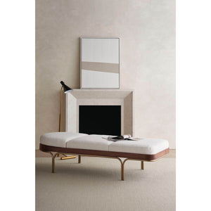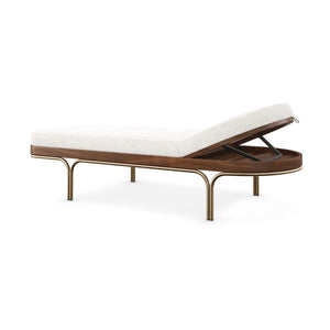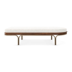 Form and function in perfect cadence: the chaise introduces a relaxed yet refined aesthetic to living interiors. Covered in a soft, wool-like fabric with a sleek base in Natural Walnut and Lucent Bronze Metallic paint.