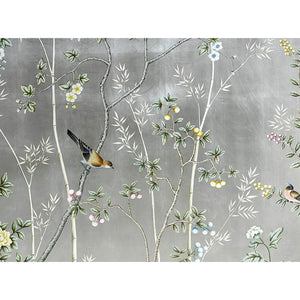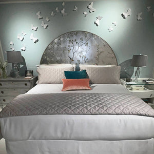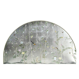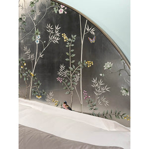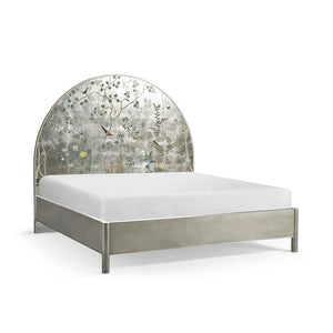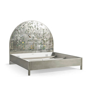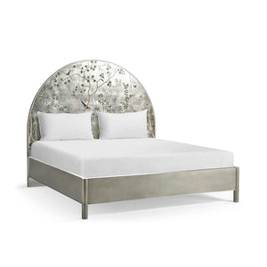 The headboard, a stunning half-moon shape, showcases a hand-painted Chinoiserie silver leaf panel, adding an element of refined elegance to your space. The frame's silver lacquered finish complements the intricate headboard design, harmoniously blending traditional artistry with contemporary style.