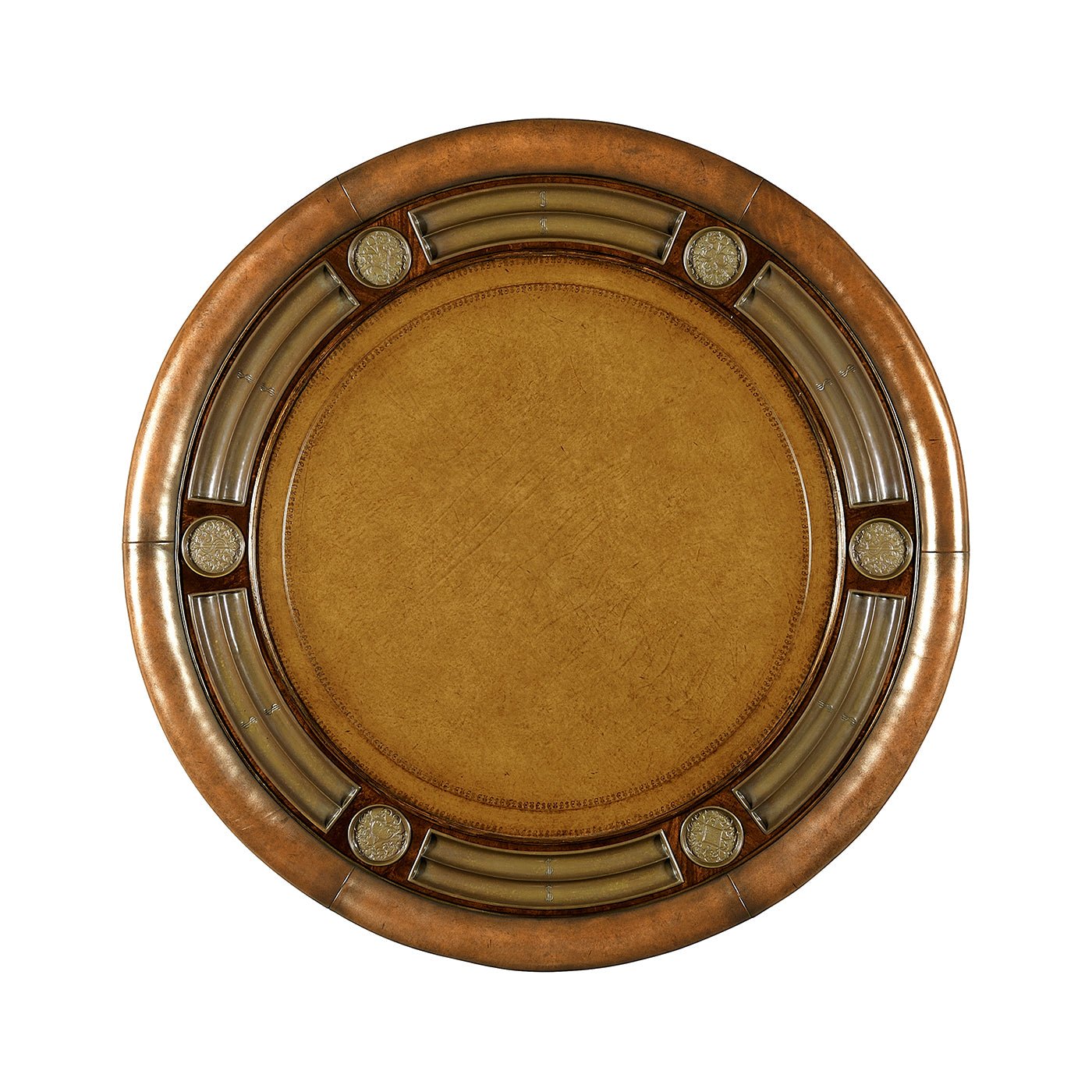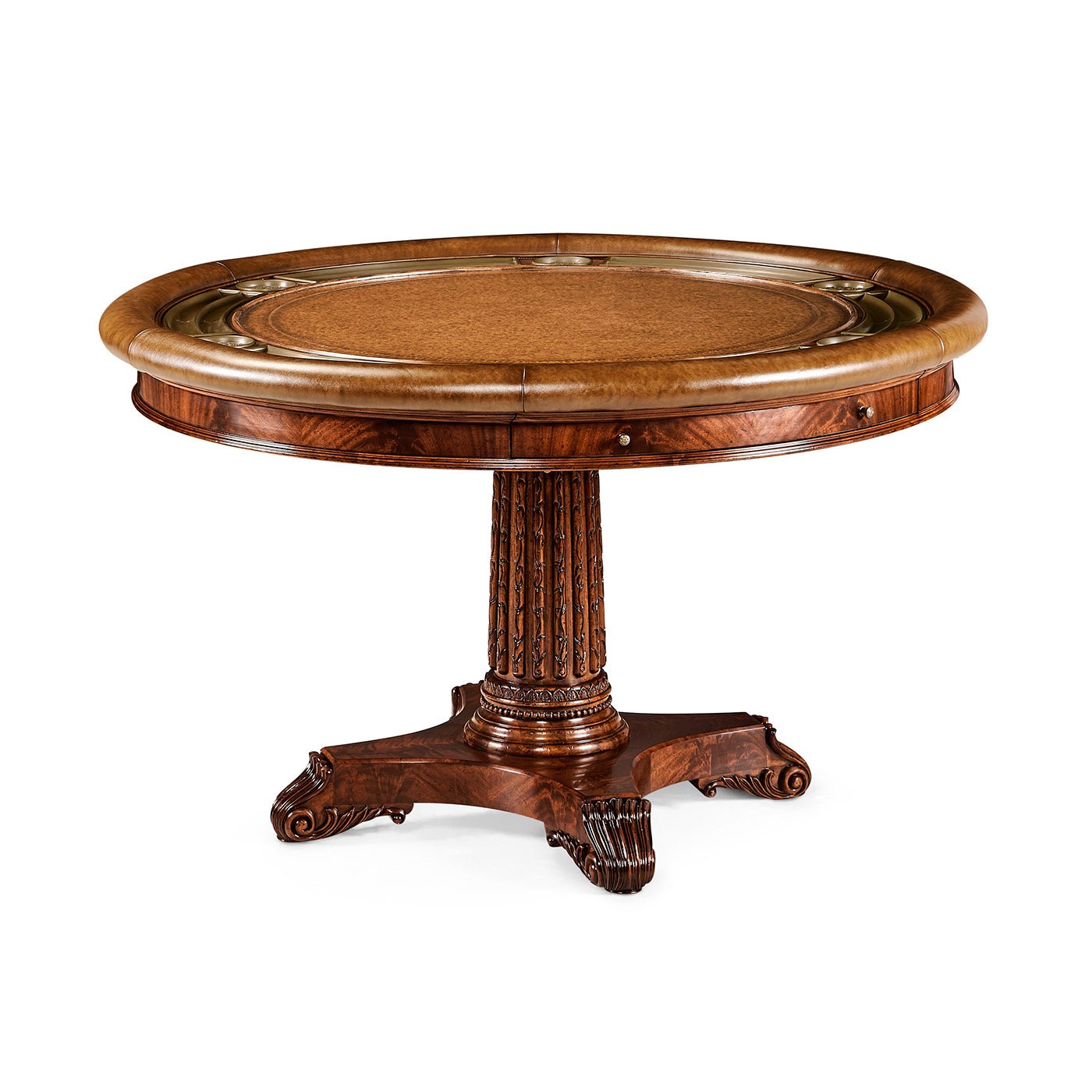 The English Mahogany Round Poker Table blends Regency-style elegance with practical features for gaming. Made from rich mahogany, its round top has a leather playing surface and a raised edge to keep cards and chips in place. Cup holders built into the edge add convenience and a touch of luxury, making it a sophisticated choice for card games.
