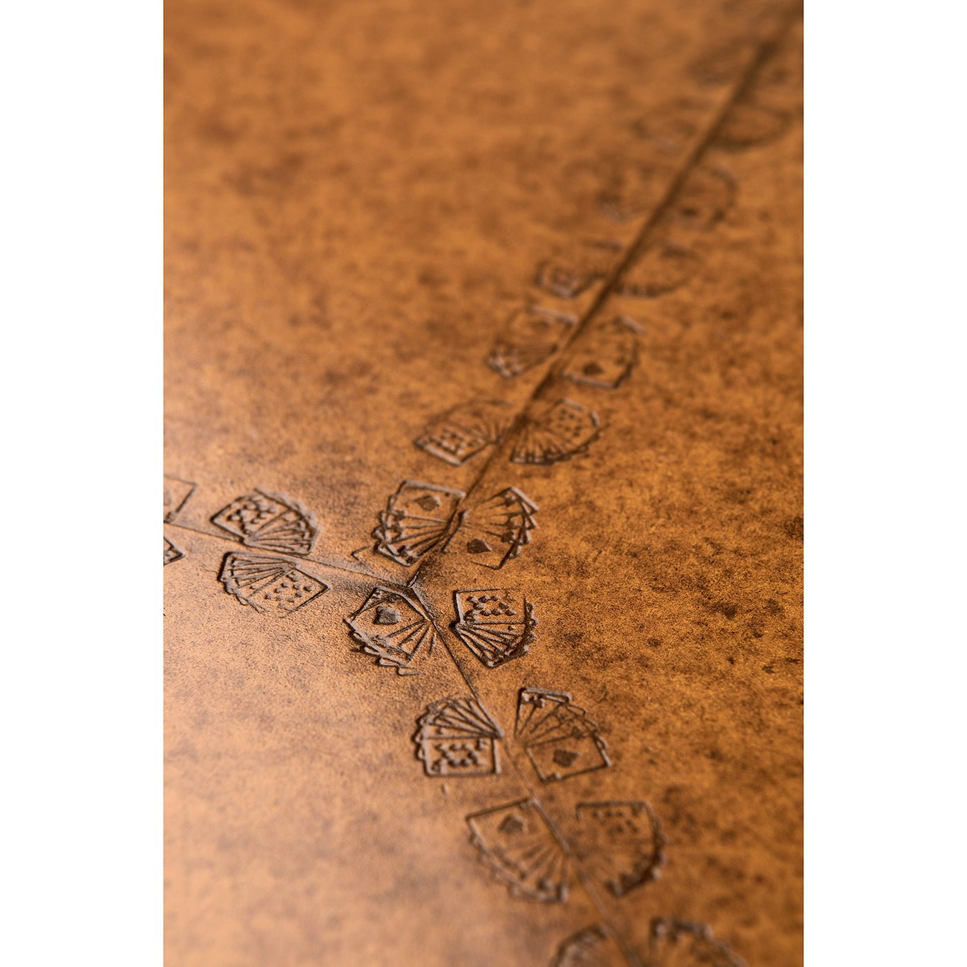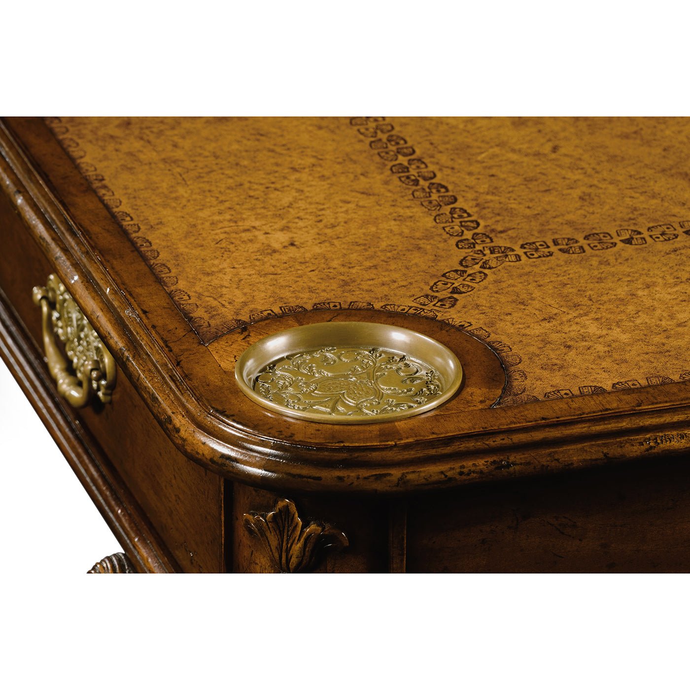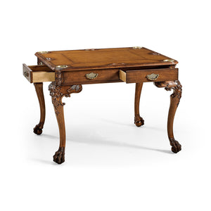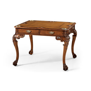 The George II Walnut Leather Top Games Table is a richly detailed interpretation of mid-18th-century English Rococo design, executed in the manner of William Kent. The square walnut form is distinguished by boldly carved cabriole legs, each shoulder adorned with expressive grotesque masks that transition into realistically carved lion’s paw feet. This sculptural base gives the table a commanding presence while reflecting the robust elegance associated with the George II period.