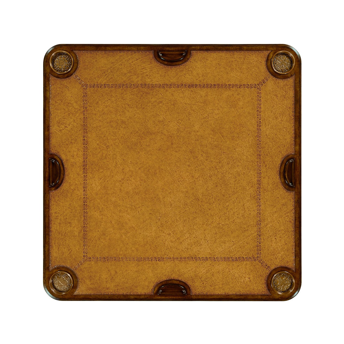 An inset tan leather playing surface defines the tabletop, framed by a walnut surround and fitted with integrated brass cup holders at the corners, underscoring its original function as a gentleman’s card or games table. The combination of ornate carving, practical gaming features, and balanced proportions makes this piece equally suited for a library, study, or formal games room, where it can serve as both a functional table and a statement of classical English craftsmanship.