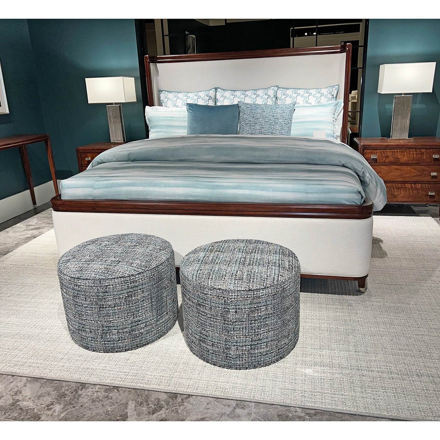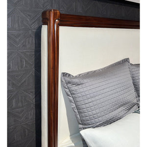 The headboard and footboard are upholstered in Marshmallow Performance fabric, offering both a plush feel and lasting durability. The contrast between the smooth, polished walnut and the soft, neutral upholstery enhances the bed’s opulent appeal. Designed as a statement piece, bed is perfect for those who appreciate a blend of historical grandeur and contemporary refinement, bringing an air of timeless elegance to any bedroom setting.