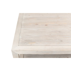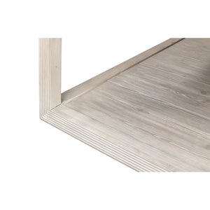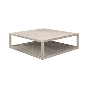 Its expansive square surface makes it ideal for entertaining, while the integrated lower shelf offers convenient storage or display for books, baskets, or decorative accents. Combining minimalist structure with a rustic yet elegant finish, this piece complements coastal, modern, or transitional interiors with ease.