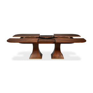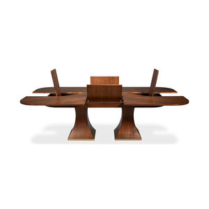 The Rectangular Walnut Jupe Dining Table makes an unforgettable statement in style, beauty, and functionality. Finished in Dark Walnut, its unusual rectangular jupe design combines architectural elegance with modern practicality. The self-storing expansion mechanism, crafted from extruded aluminum, allows effortless operation and expands the table to accommodate up to 12 guests when fully extended. A book-matched veneer top with geometric patterning further enhances its sophisticated appeal.