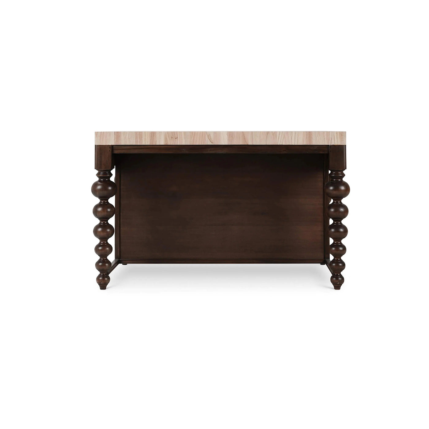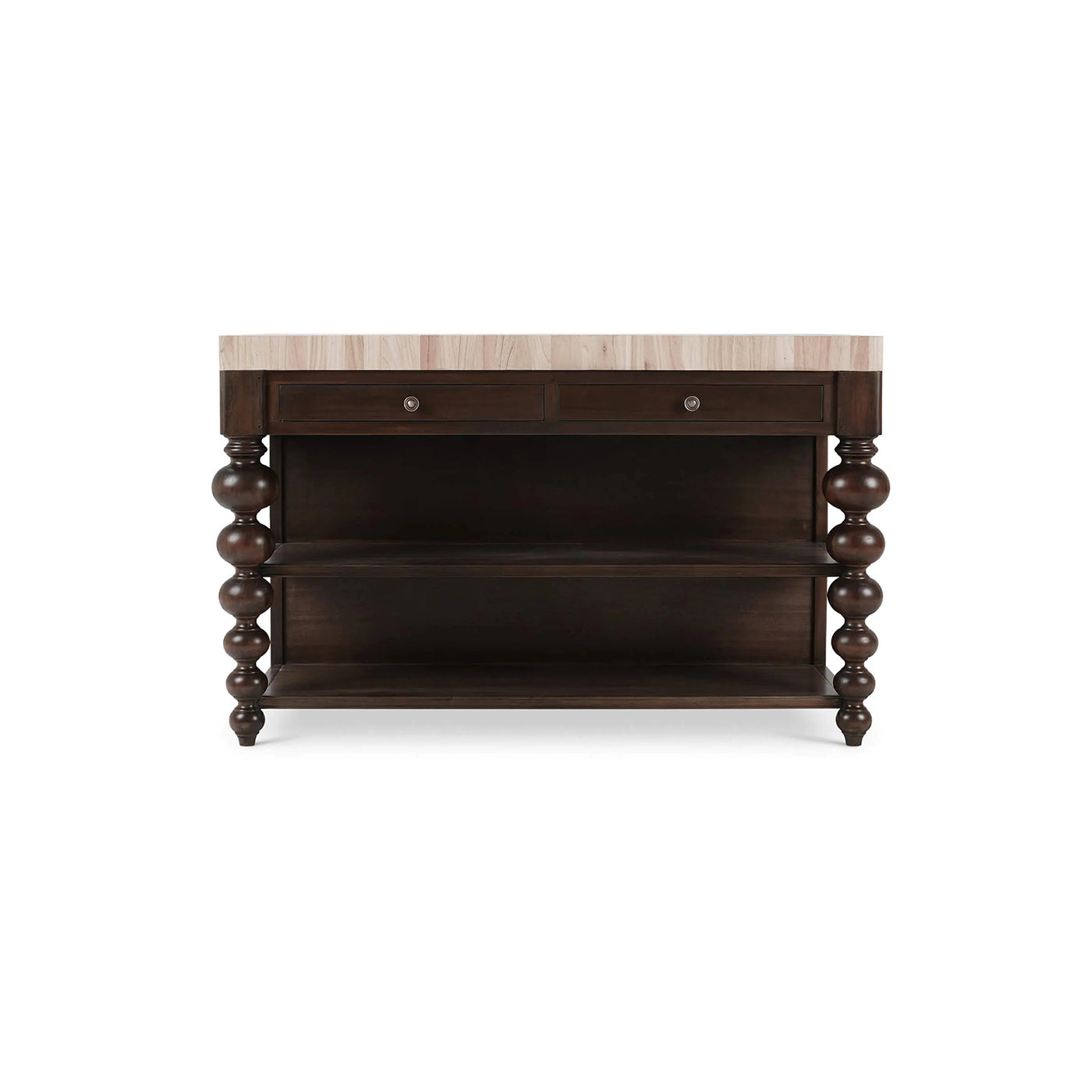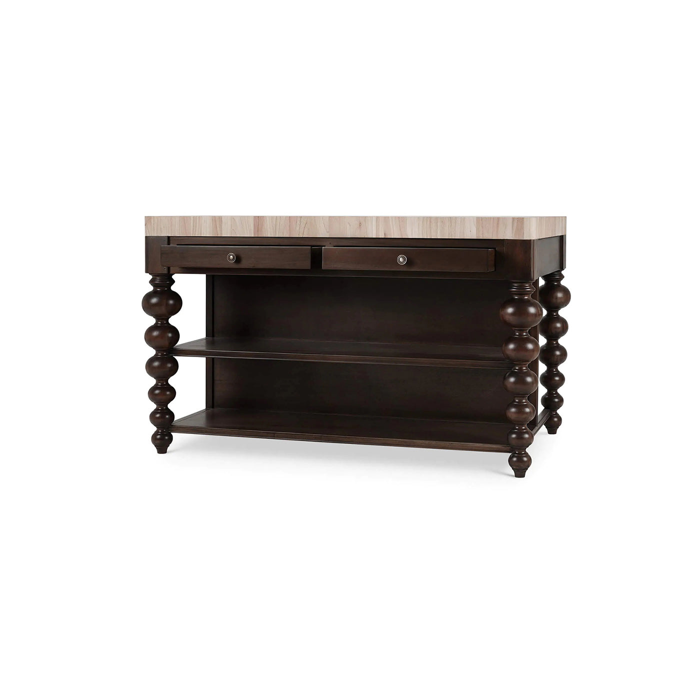 The dark walnut-stained base adds depth, and the open shelves and simple drawers offer useful storage without making the island look busy. With subtle hardware and balanced proportions, the craftsmanship stands out. This island works well as a kitchen centerpiece or as an accent in farmhouse or transitional spaces. It blends classic and modern style for lasting appeal.