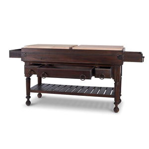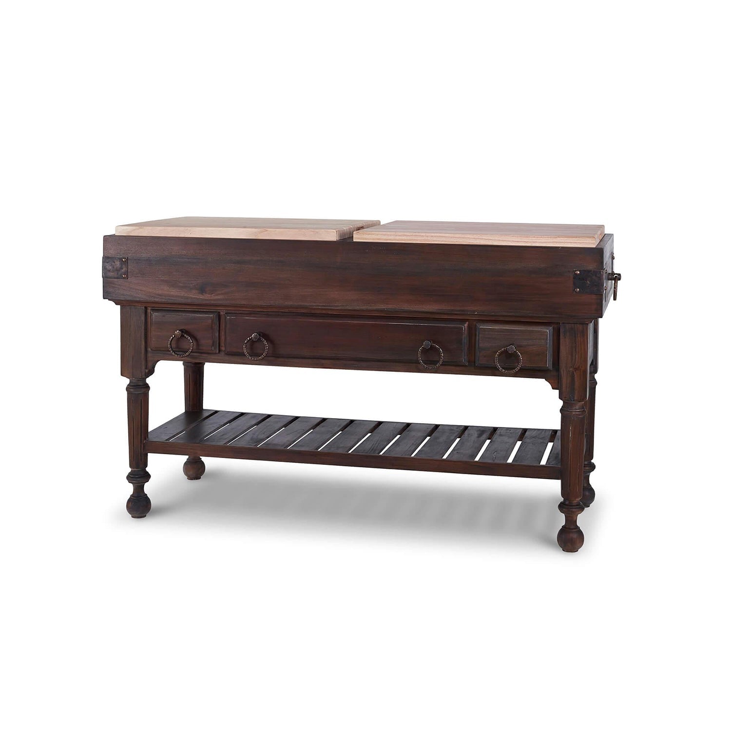 The French Boucherie features a spacious butcher block top, perfect for food preparation and display. Below, you'll find several drawers adorned with vintage-inspired ring pulls, providing convenient storage for your kitchen essentials. The lower slatted shelf offers additional space for larger items or decorative pieces.