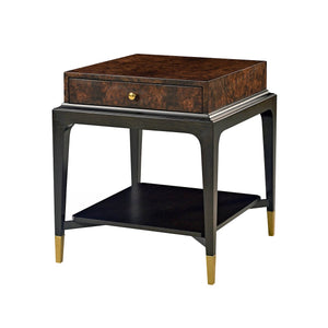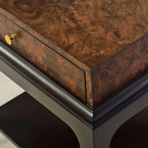 The Art Deco Burl Walnut End Table delivers timeless style in a refined, compact form. Its drawer box is crafted in a natural-finish walnut burl veneer, showcasing a luxurious depth of grain and movement. A single drawer offers discreet storage, accented with a round brass knob for a subtle gleam.