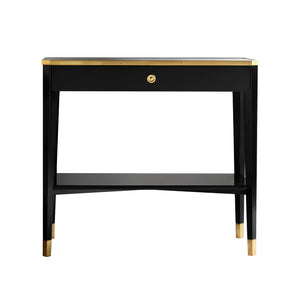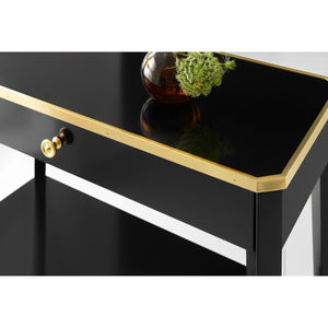 Elevate your interior with the refined elegance of the Black Mid Century Bedside Table. Inspired by French mid-century modern design, this sophisticated piece combines timeless style with practical features. Its sleek black lacquer finish is complemented by brass accents and hardware, creating a striking contrast that exudes opulence.