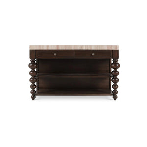 The dark walnut-stained base adds depth, and the open shelves and simple drawers offer useful storage without making the island look busy. With subtle hardware and balanced proportions, the craftsmanship stands out. This island works well as a kitchen centerpiece or as an accent in farmhouse or transitional spaces. It blends classic and modern style for lasting appeal.