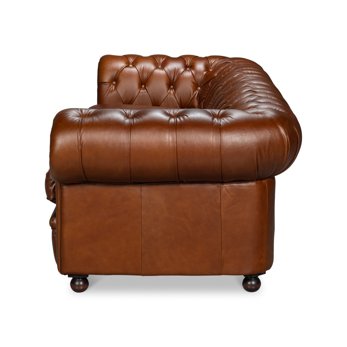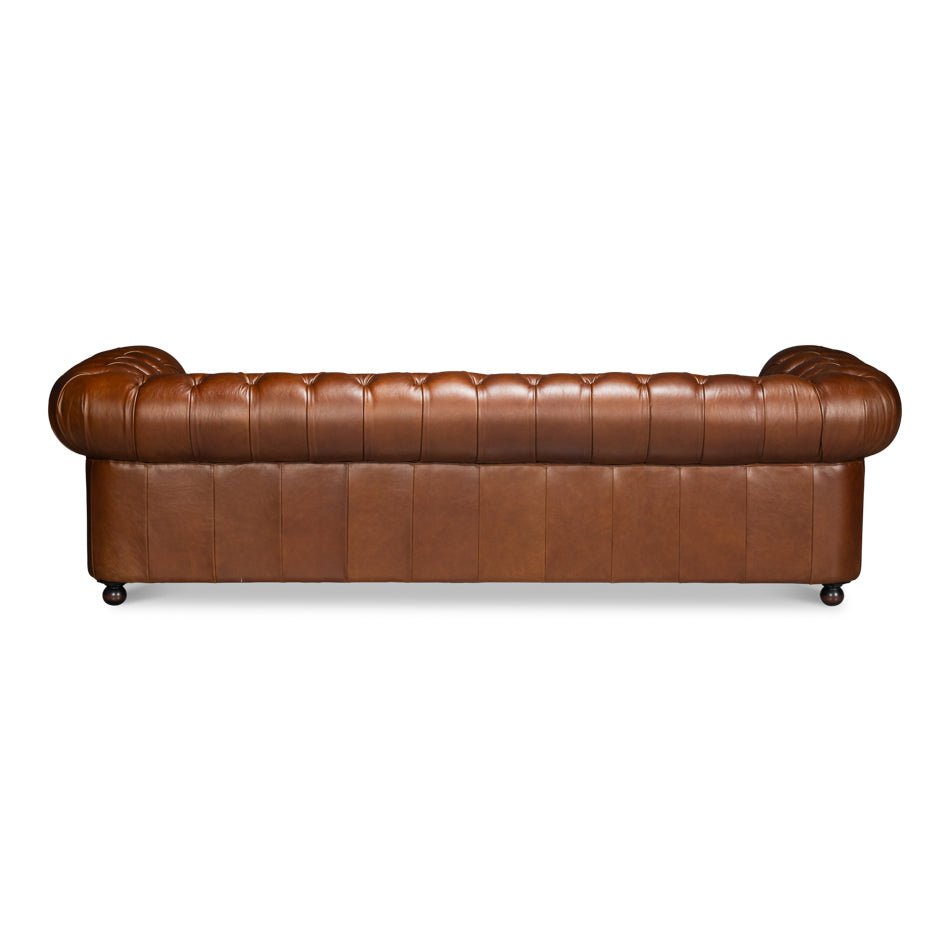 Upholstered in Marseille dark brown leather, the surface shows a smooth, richly saturated tone that enhances the depth of the tufting and the sofa’s symmetry. Turned wooden feet ground the piece with traditional craftsmanship. The generous scale and tight upholstery make it ideal for formal living rooms, libraries, or study spaces. Both stately and inviting, this design reflects a legacy of comfort, authority, and enduring sophistication.