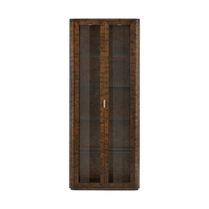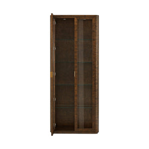 Elevate your home décor with the Burl Art Deco Curio Cabinet, showcasing a stunning contrast of sleek glass against a rich Tamo ash burl veneer. Finished in a luxurious Pyramid Brown with Satin Brass accents, this cabinet exudes timeless elegance and sophistication.