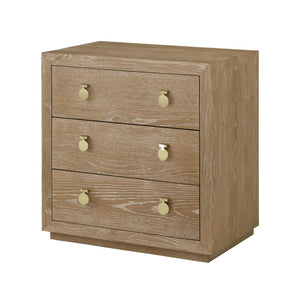 The Cerused Oak Bedside Chest with Brass Hardware showcases the distinctive grain of oak wood enhanced by a cerused finish that highlights its natural texture. The modern design features clean lines and a substantial block form, accented by contemporary brass drawer pulls that add a sophisticated metallic element.