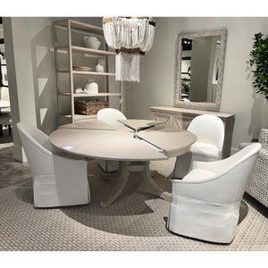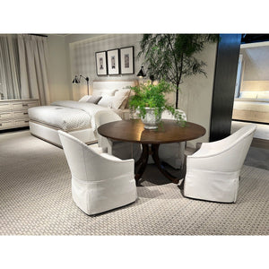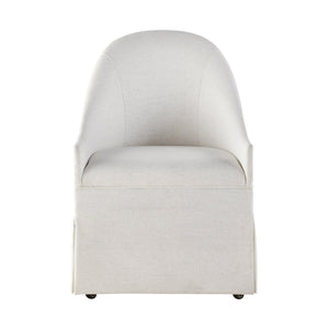 Indulge in luxurious comfort with the Classic Skirted Dining Chair, where slender lines and a polished silhouette create a refined and timeless design. The chair’s gracefully curved arms and seamless form offer both style and support, making it a perfect addition to any dining room. Upholstered in an elegantneutral Fabric and finished with meticulous welting trim, this chair brings an air of sophistication to your dining space.