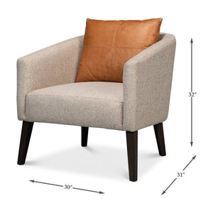 The addition of a contrasting leather back cushion in a warm brown tone adds a sophisticated touch and enhances comfort. The chair's contemporary flair shines through with a distinctive split-back design, making it a perfect fit for both traditional and modern interiors. Ideal for living rooms, bedrooms, or cozy reading nooks, this versatile chair offers both style and comfort.