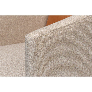 The addition of a contrasting leather back cushion in a warm brown tone adds a sophisticated touch and enhances comfort. The chair's contemporary flair shines through with a distinctive split-back design, making it a perfect fit for both traditional and modern interiors. Ideal for living rooms, bedrooms, or cozy reading nooks, this versatile chair offers both style and comfort.